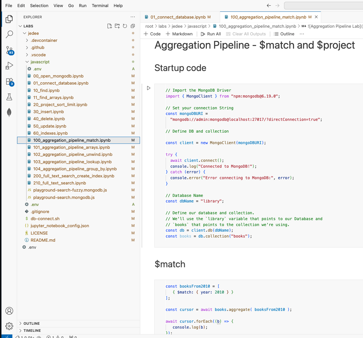 Open the 100_aggregation_pipeline_match file in the Instruqt IDE or GitHub Codespaces. Run the Startup Code, that will import all the neccessary modules and connect to the local MongoDB cluster. Then, run the $match cell.