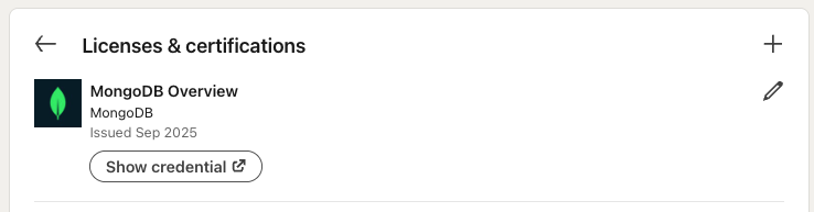 You now have everything you need to earn your MongoDB Overview Skill Badge β an official recognition of your MongoDB knowledge. Claim your badge for free and proudly display it on your LinkedIn profile under Licenses & Certifications!