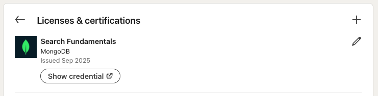 You now have everything you need to earn your Search Fundamentals Skill Badge β an official recognition of your MongoDB knowledge. Claim your badge for free and proudly display it on your LinkedIn profile under Licenses & Certifications!