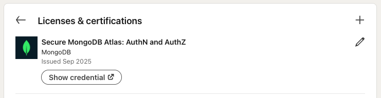 You now have everything you need to earn your Secure MongoDB Atlas: AuthN and AuthZ Skill Badge — an official recognition of your MongoDB knowledge. Claim your badge for free and proudly display it on your LinkedIn profile under Licenses & Certifications!