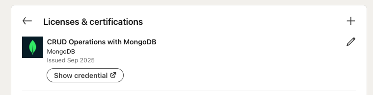 You now have everything you need to earn your CRUD Operations MongoDB Skill Badge โ an official recognition of your MongoDB knowledge. Claim your badge for free and proudly display it on your LinkedIn profile under Licenses & Certifications!